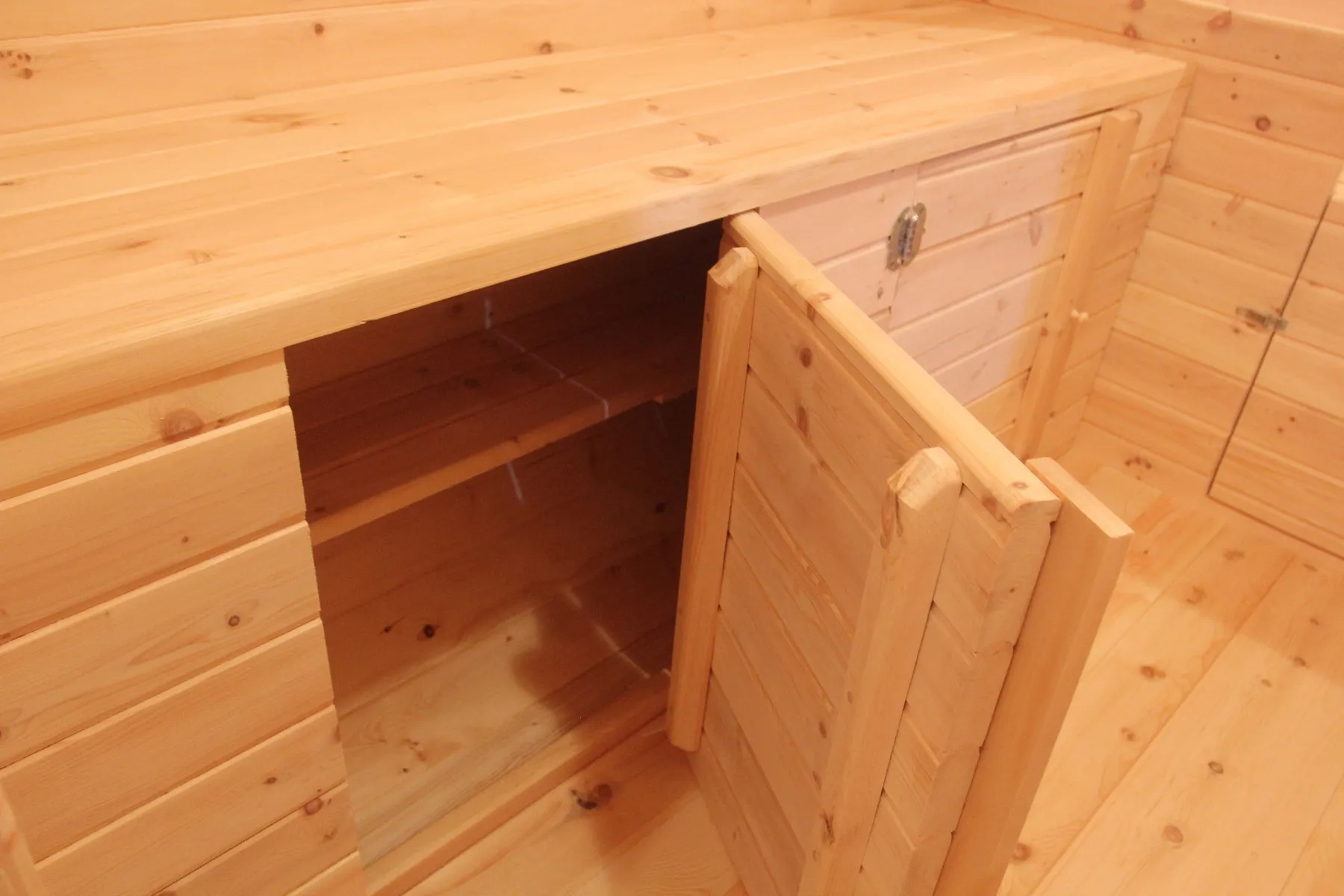 Домик подходит для дачного использования в теплое время года или обустройства загородных баз отдыха. Его можно разграничить на две зоны и использовать как кухню и спальное помещение. Домик оборудован увеличенным окном, четырьмя лежаками из кедра, вешалкой и полкой из кедра. Для удобства пользования кемпинг дом можно укомплектовать верандой с лавочками или козырьком.
