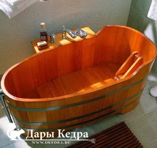 - Кедр, природный антисептик, создаёт целебный микроклимат, насыщает фитонцидами воду и воздух в ванной комнате. Во время водных процедур вы будете наслаждаться приятным хвойным ароматом, исходящим от дерева.